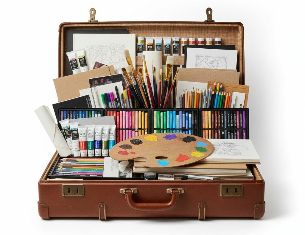 Gouache- und Acrylfarben, Pastellkreiden, Wachs- und Ölpastellkreiden, Aquarellfarben, Ton, Speckstein, Buntstifte, verschiedene Papiere und Kartonagen, Bastelmaterialien, verschiedene Pinsel, Spachtel, Malerrollen und andere Werkzeuge zum kreativen arbeiten.